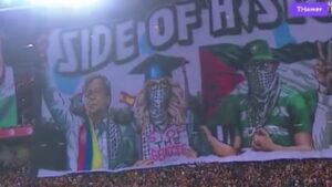Una imagen gigante del presidente de Colombia Gustavo Petro apareció en un estadio de fútbol [...]